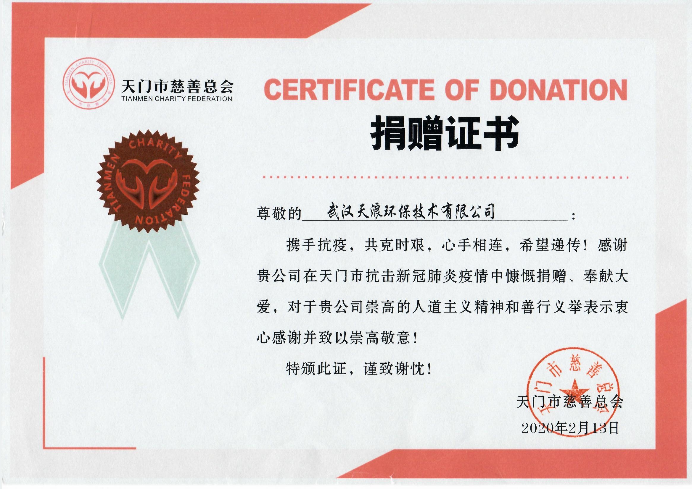 面對(duì)突如其來的疫情,武漢天浪積極履行社會(huì)責(zé)任,于2020年2月13日向天門市慈善總會(huì)捐款,為抗擊疫情貢獻(xiàn)了天浪人的一份力量。雖然綿薄,但滿是深情。
