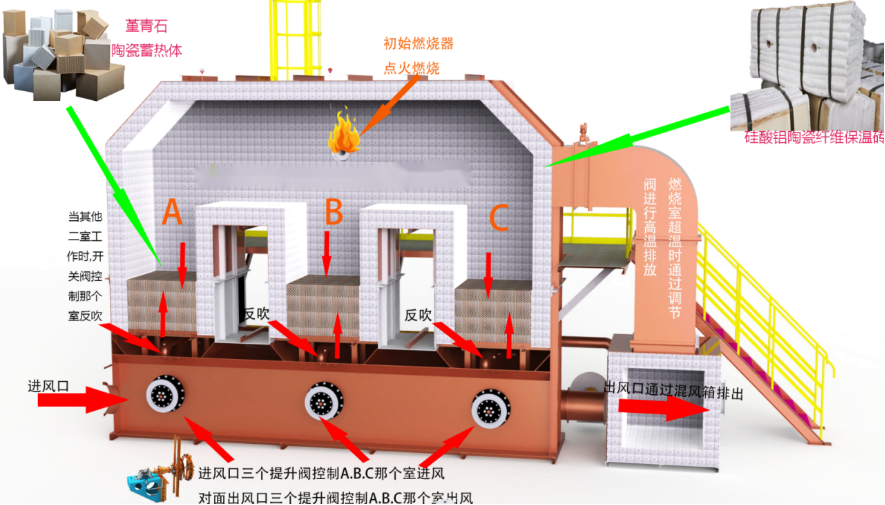 階段一:廢氣通過(guò)蓄熱床A被預(yù)熱,然后進(jìn)入燃燒室燃燒,蓄熱床C中殘留未處理廢氣被凈化后的氣體反吹回燃燒室進(jìn)行焚燒處理(吹掃功能),分解后的廢氣經(jīng)過(guò)蓄熱床B排出,同時(shí)蓄熱床B被加熱。