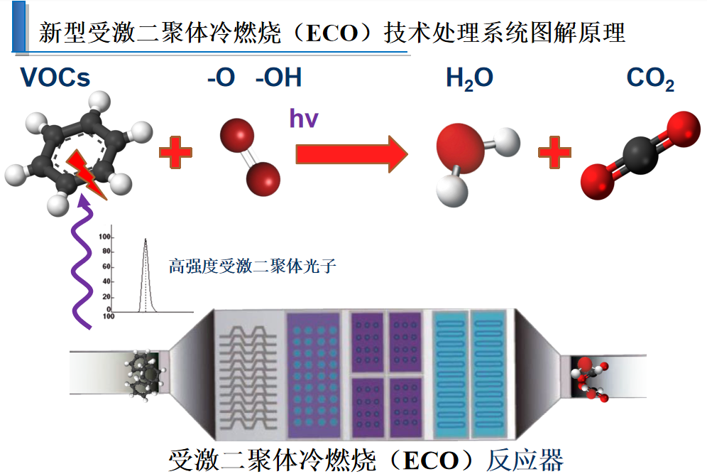 我公司針對(duì)低濃度、大風(fēng)量的VOCs有機(jī)廢氣,利用新型的低溫氧化處理技術(shù)開發(fā)出了一套化工尾氣ECO冷燃燒處理裝置。該裝置通過受激二聚體光子誘導(dǎo),常溫氧化揮發(fā)性有機(jī)物VOCs和異味、惡臭氣體,克服了UV光催化氧化技術(shù)紫外光強(qiáng)度低,處理效果差的技術(shù)瓶頸,同時(shí)避免了傳統(tǒng)方法運(yùn)行維護(hù)成本高的難題。